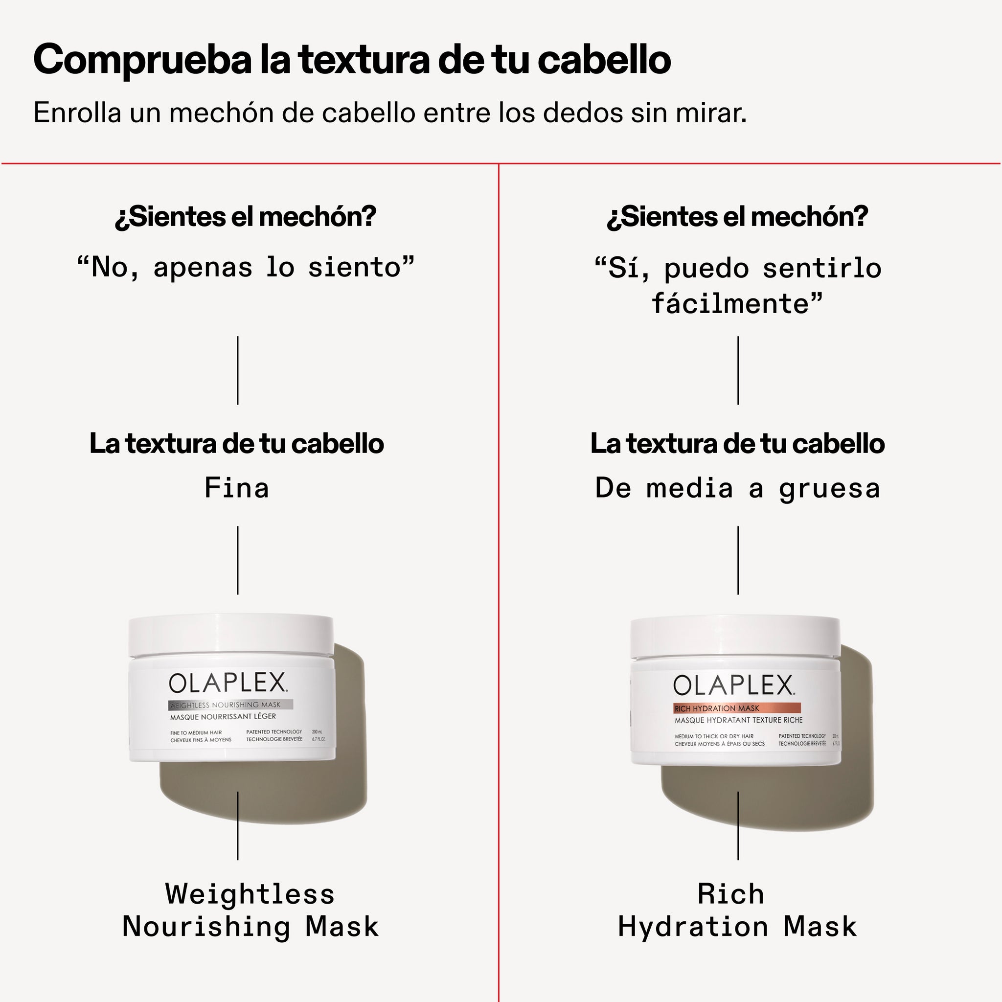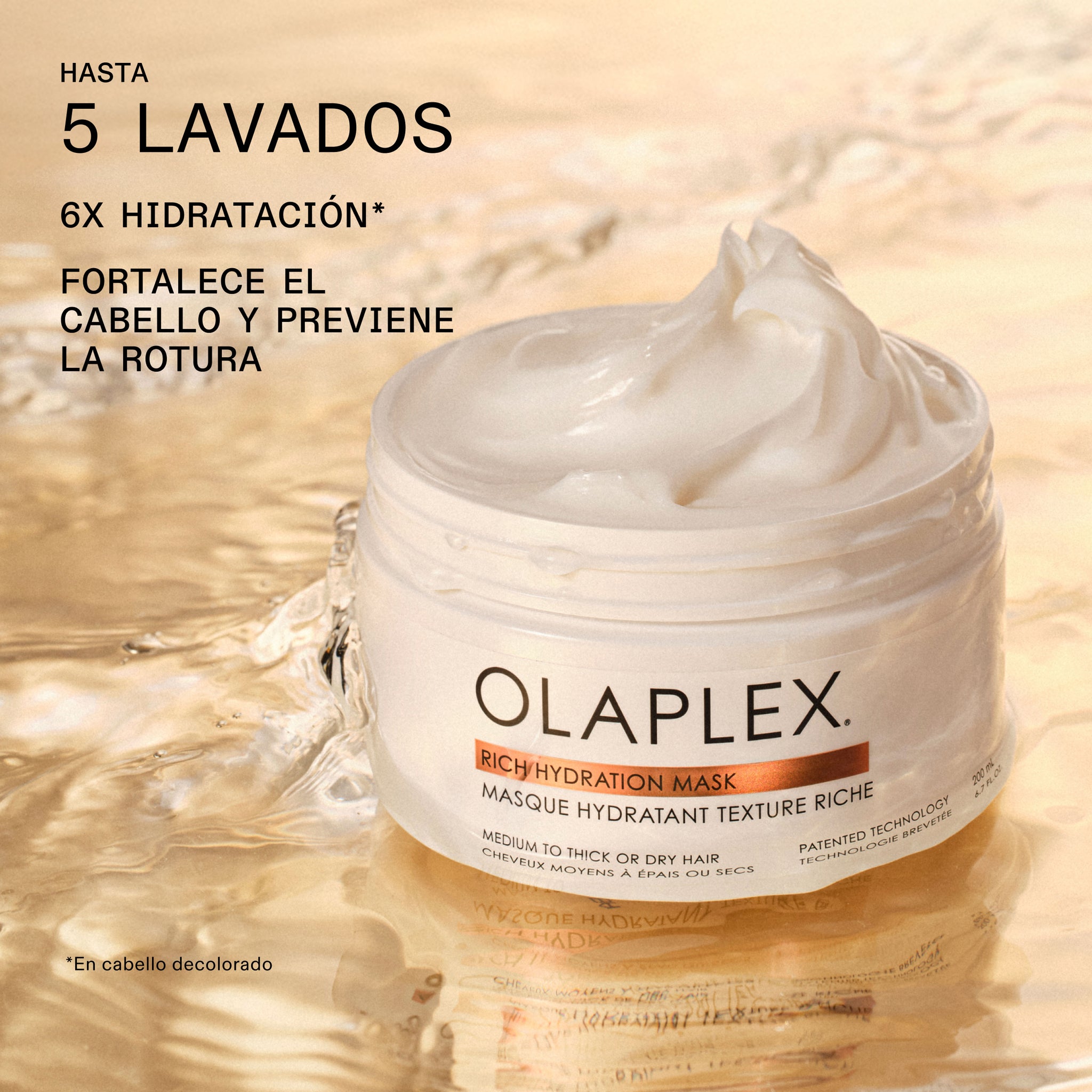 Esta mascarilla capilar profundamente reparadora e hidratante para cabellos deshidratados o de textura media a gruesa está formulada con OLAPLEX Biomimetic Cuticle Technology™, que retiene la hidratación y fortalece, además de sellar las cutículas capilares hasta 5 lavados para evitar la pérdida de hidratación. Esta mascarilla capilar hidratante protege y reduce la rotura al instante hasta 5 lavados, a la vez que aporta brillo y control de frizz durante todo el día.